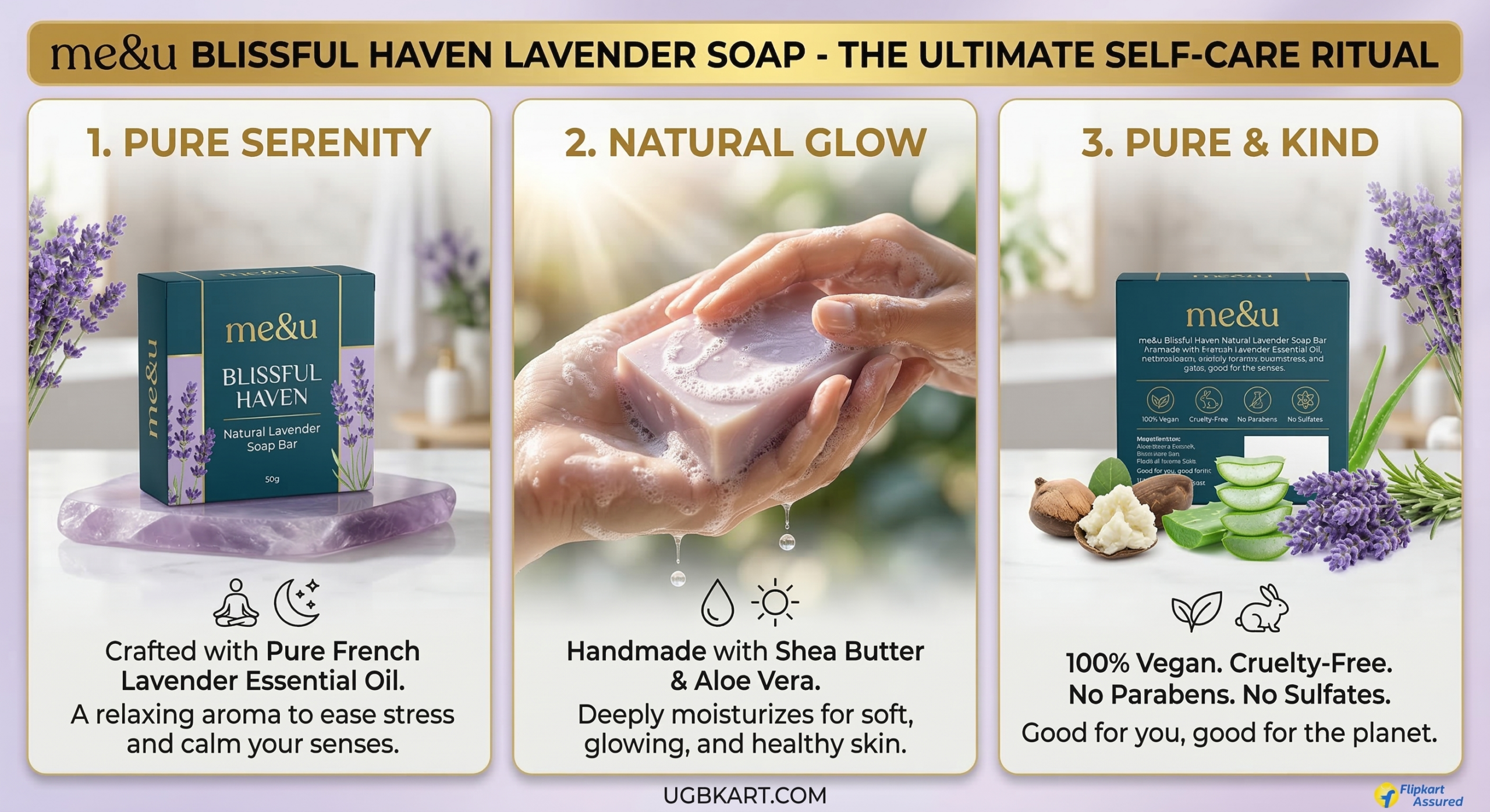 100% Natural & Organic: Hamara soap pure Lavender Essential Oil aur Shea Butter se bana hai, jo skin ko natural chamak deta hai.